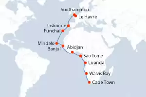 Itinéraire : Cape Town, Walvis Bay, Luanda, Sao Tome, Abidjan, Banjul, Mindelo, Funchal, Lisbonne, Le Havre, Southampton