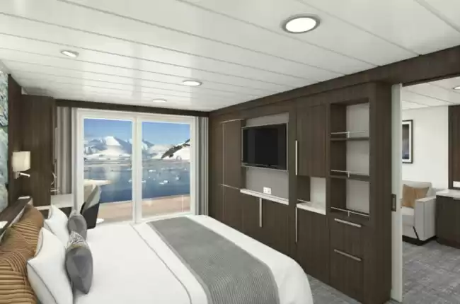 Toutes les cabines sont chaleureuses et dotées de toutes les commodités : lit king size, coin bureau, penderie, salle de bain privée, thermostat individuel et télévision à écran plat.