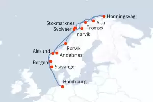 Long de 138,5 m pour 21,5 m de large, le MS Finnmarken propose un confort moderne et peut accueillir jusqu’à 526 passagers. Il offre de vastes espaces d’observation extérieurs pour profiter des panoramas côtiers.