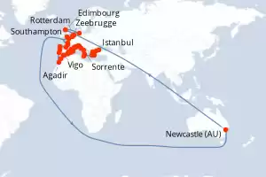 Itinéraire : Southampton, Zeebrugge, Rotterdam, Ijmuiden (Amsterdam), Newcastle, Edimbourg, Hambourg, Le Havre, La Rochelle, Pauillac, Bilbao, La Corogne, Vigo, Porto, Lisbonne, Agadir, Casablanca, Algeciras, Malaga, Carthagene, Ibiza, Mahon, Barcelone, Valence, Palma de Majorque, Alicante, Marseille, Saint Tropez, Monaco Monte-Carlo, Cinqueterre, Florence/Pise (Livourne), Civitavecchia - Rome, Sorrente, Catane, La Valette, Gythion, Milos, Le Piree - Athenes, Volos, Canakkale, Istanbul