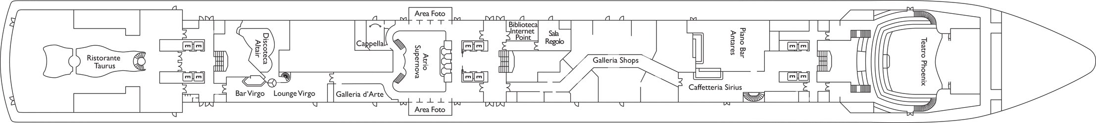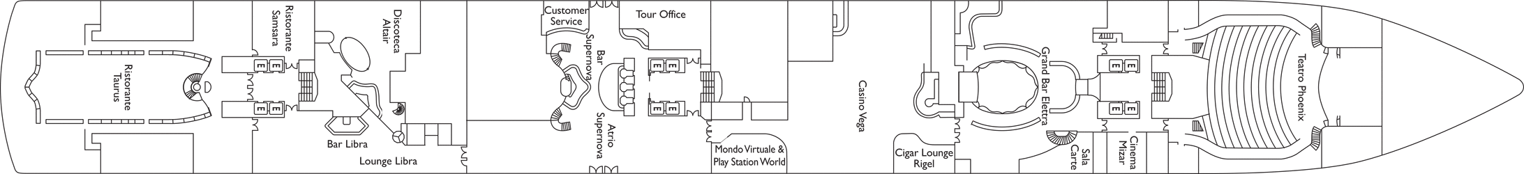 la compagnie a mis un soin particulier à diversifier les 11 bars et salons du bateau afin que vous puissiez toujours trouver un endroit où prendre un verre selon vos envies, dans un cadre cosy et intimiste ou en plein air au bord de la piscine. Si vous appréciez ces soirées calmes bercées de musiques douces, rendez-vous au piano-bar Antares. Si au contraire vous souhaitez passer un moment festif, préférez le grand bar Elettra théâtre de belles soirées dansantes. Le bar à chocolat Sirius pour sa part vous convie à une succulente pause gourmande. Pour les fumeurs, divers endroits leur sont réservés à bord du bateau, dont le Cigar Lounge distillant une belle ambiance feutrée. Avant de passer à table, découvrez divers bars à proximité des principaux restaurants du navire comme les bars Virgo et Libra situés aux portes du restaurant Taurus.