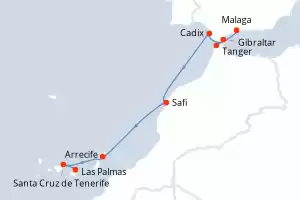Itinéraire : Malaga, Tanger, Gibraltar, Cadix, Safi, Arrecife, Santa Cruz de Tenerife, Las Palmas