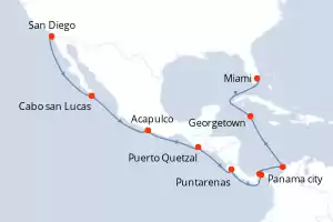 Itinéraire : San Diego, Cabo san Lucas, Acapulco, Puerto Quetzal, Puntarenas, Panama city, Canal de Panama, Carthagene CO, Georgetown, Miami