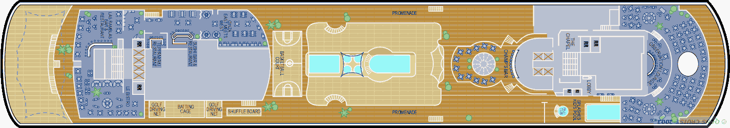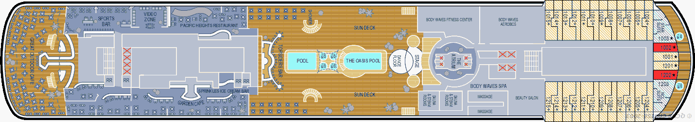 Pour les activités aquatiques, le navire compte des aménagements agencés sur le pont 11. Au milieu du navire, deux piscines s'ouvrent aux passagers entre 7 et 22 heures. Les deux piscines sont séparées par quatre bains à remous pour permettre aux passagers de se détente. Les piscines du bateau sont servies par le Topsiders Bar pour se désaltérer après un instant passé au soleil et une piste de danse pour divertir les passagers lors des animations nocturnes sur le pont. Les enfants bénéficient également de leurs propres espaces aquatiques sur le pont 12 avec une petite piscine de deux pieds de profondeur, une petite cascade et un bain à remous pour enfants.