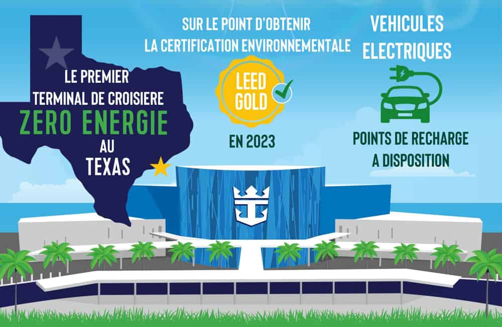 - Le premier terminal de croisière texan qui s’attend à recevoir la « LEED Gold » en 2023. Cette certification LEED (Leadership in Energy and Environmental Design) est accordée aux projets qui se distinguent par une excellente maîtrise des émissions de CO2, de l’énergie, de l’eau, des déchets, du transport, de la santé et de la qualité de l’environnement intérieur.