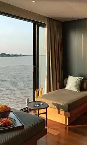 Les suites à bord des navires Aqua Expeditions, tels que l'Aqua Nera ou l'Aqua Mekong, sont conçues pour offrir une intimité totale sans jamais couper le lien visuel avec la nature. Chaque suite est un chef-d'œuvre de design, souvent décorée avec de l'artisanat local haut de gamme. La caractéristique phare reste les immenses parois vitrées qui transforment la chambre en un écran de cinéma vivant sur le monde extérieur. Dotées de salles de bains luxueuses, de literie premium et, pour certaines, de balcons privés, ces suites garantissent un repos absolu au fil de l'eau, dans un luxe discret et chaleureux.