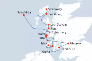 Itinéraire : Glasgow, Brodick Ile, Islay, Gigha, Tobermory, Saint Kilda, Stornoway, Îles Shiant, LOCH SCAVAIG, Eigg, Staffa , Iona, Colonsay, Glasgow