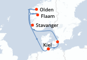 Itinéraire : Kiel, Copenhague, Hellesylt, Geiranger, Alesund, Stavanger, Kiel