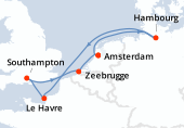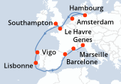Itinéraire : Southampton, Brest, Leixoes, Vigo, Cherbourg, Southampton