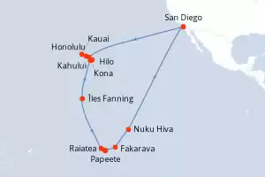 États-Unis, France, Kiribati Itinéraire: San Diego , Kona , Kahului , Honolulu , Honolulu , Kauai , Iles Fanning , Raiatea , Raiatea , Papeete , Papeete , Bahia D opuncha , Bahia D opuncha , Fakarava , Nuku Hiva , San Diego Pension Complète MS Koningsdam 36 jours Cabine standard San Diego 13/02/2027 dès 4699 € Cuisine Raffinée Expérience Premium Animations à bord exclusives Pension Complète Voir les offres