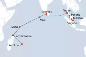 Malaisie, Maurice, Singapour, Madagascar, Seychelles, Maldives, Sri Lanka, Thaïlande Itinéraire: Singapour , Malacca , Penang , Phuket , Colombo , Male , Mahe , Antisiranana , Port Louis , Port Louis Pension Complète Seven Seas Mariner 18 jours Suite Singapour 28/03/2028 dès 9324 € Excursions illimitées offertes Restaurants de spécialités inclus Pourboires Inclus Pré-nuit Hôtel Offerte Service de blanchisserie inclus Boissons Premium incluses Pension Complète Voir les offres