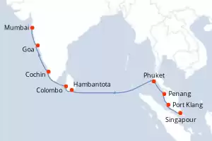 Malaisie, Singapour, Emirats Arabes Unis, Inde, Sri Lanka, Thaïlande Itinéraire: Singapour , Port Klang , Penang , Langkawi , Phuket , Galle , Colombo , Cochin , Mangalore , Goa , Mumbai , Al Fujairah , Dubai Pension Complète Oceania Nautica 19 jours Cabine standard Singapour 08/05/2027 dès 5265 € Jusqu'à 50% de remise Tous les restaurants inclus Boissons sans alcool illimitées Pourboires inclus Wi-Fi illimité inclus Crédit excursion offert OU Forfait boissons offert Pension Complète Voir les offres