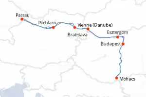 Chez moi sur le Danube Itinéraire: Passau , Vienne , Esztergom , Budapest , Mohacs , Budapest , Bratislava , Pöchlarn , Passau Pension Complète Viktoria 8 jours Cabine extérieure Passau 26/10/2026 dès 924 € All inclusive disponible Pension Complète Autres départs : 23 mars 26 13-20 avr. 26 11-18-25 mai 26 Autres départs Voir les offres