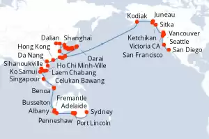 Australie,Indonésie,Singapour,Thaïlande,Cambodge,Vietnam,Chine,Taïwan,Corée du Sud,Japon,États-Unis,Canada Itinéraire: Sydney , Sydney , Penneshaw , Adelaide , Port Lincoln , Albany , Bussleton , Fremantle , Fremantle , Benoa , Celukan Bawang , Singapour , Ko Samui , Laem Chabang , Laem Chabang , Sihanoukville , Ho Chi Minh-Ville , Ho Chi Minh-Ville , Ho Chi Minh-Ville , Da Nang , Ha Long Bay , Ha Long Bay , Hong Kong , Hong Kong , Taipei , Ishigaki , Okinawa , Shanghai , Shanghai , Shanghai , Dalian , Tianjin , Tianjin , Incheon , Yeosu , Busan , Busan , Hakata , kitakyushu , Hiroshima , Beppu , kochi , Kobe , Kobe , Shimizu , Tokyo , Tokyo , Oarai , Miyako , Kodiak , Juneau , Sitka , Ketchikan , Vancouver , Seattle , Victoria CA , Astoria , San Francisco , San Diego Pension Complète Azamara Quest 92 jours Cabine standard Sydney 22/02/2027 dès 27199 € Restauration raffinée Service attentionné Boissons all-inclusive Pourboires inclus AzAmazing Evenings Inclus Pension Complète Voir les offres