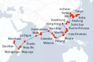 Kenya,Tanzanie,Madagascar,Seychelles,Maldives,Sri Lanka,Inde,Thaïlande,Singapour,Brunei,Malaisie,Philippines,Chine,Taïwan,Corée du Sud,Japon Itinéraire: Mombasa , Zanzibar , Dar es-Salam , Mahajunga - Majunga , Nosy Be , Diego-Suarez , Praslin , La Digue , Mahe , Mahe , Male , Male , Colombo , Hambantota , Trincomalee , Port Blair , Phuket , Penang , Malacca , Singapour , Muara , Kota Kinabalu , Puerto Princesa , Coron , Boracay , Manille , Manille , Subic bay , Hong Kong , Hong Kong , Kaoshiung , Keelung , Ishigaki , Jeju , Yeosu , Incheon , Incheon , Busan , Fukuoka , Nagasaki , Kagoshima , Beppu , kochi , Kobe , Nagoya , Tokyo Pension Complète Crystal Symphony 59 jours Cabine extérieure Mombasa 06/02/2026 dès 28300 € Boissons incluses Pourboires inclus Service de majordome inclus Wifi standard illimité inclus Pension Complète Voir les offres