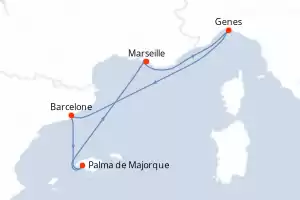 France, Italie, Espagne, Baléares Itinéraire: Marseille , Genes , Barcelone , Barcelone , Palma de Majorque , Marseille Pension Complète Costa Toscana 6 jours Cabine standard Marseille 15/02/2026 dès 299 € + dès 532 € Offre train A/R dès 99€ Enfants Gratuits jusqu'à 18 ans Club Enfants dès 3 ans Pension Complète Départ de France Autres ports d'embarquement : Genes Voir les offres