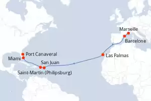 États-Unis, Porto Rico, Pays-Bas, Espagne, France Itinéraire: Marseille , Barcelone , Las Palmas , Saint-Martin (Philipsburg) , San Juan , Miami , Port Canaveral Pension Complète MSC Grandiosa 17 jours Cabine standard Marseille 20/11/2025 dès 577 € + dès 1317 € Black friday jusqu'à -50% Internet à bord Clubs Enfants dès 3 ans Enfants Gratuits jusqu'à 12 ans Pension Complète Départ de France Voir les offres