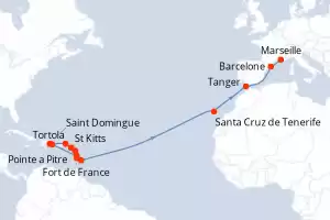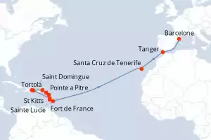 Antilles, Canaries, Maroc, Espagne, France Itinéraire: Fort de France , Pointe a Pitre , Sainte Lucie , La Barbade , Santa Cruz de Tenerife , Tanger , Barcelone , Marseille Pension Complète Costa Fascinosa 16 jours Cabine standard Fort de France 12/03/2026 dès 579 € + dès 1349 € Enfants Gratuits jusqu'à 18 ans Club Enfants dès 3 ans Pension Complète Voir les offres