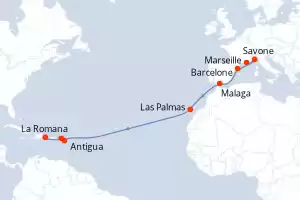France, Italie, Espagne, Canaries, Antilles, Rép.Dominicaine Itinéraire: Marseille , Savone , Barcelone , Malaga , Las Palmas , Pointe a Pitre , Saint-Martin (Philipsburg) , La Romana Pension Complète Costa Fascinosa 17 jours Cabine standard Marseille 04/12/2026 dès 889 € Enfants Gratuits jusqu'à 18 ans Club Enfants dès 3 ans Pension Complète Départ de France Voir les offres