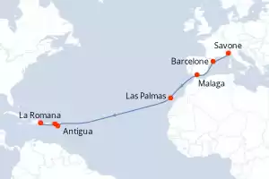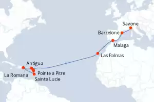 Italie, Espagne, Canaries, Antilles, Rép.Dominicaine Itinéraire: Savone , Barcelone , Malaga , Las Palmas , Pointe a Pitre , Saint-Martin (Philipsburg) , La Romana Pension Complète Costa Fascinosa 16 jours Cabine standard Savone 05/12/2026 dès 839 € Enfants Gratuits jusqu'à 18 ans Club Enfants dès 3 ans Pension Complète Voir les offres