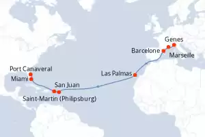 États-Unis, Porto Rico, Pays-Bas, Espagne, France, Italie Itinéraire: Genes , Marseille , Barcelone , Las Palmas , Saint-Martin (Philipsburg) , San Juan , Miami , Port Canaveral Pension Complète MSC Grandiosa 18 jours Cabine standard Genes 19/11/2025 dès 821 € Black friday jusqu'à -50% Internet à bord Clubs Enfants dès 3 ans Enfants Gratuits jusqu'à 12 ans Pension Complète Voir les offres
