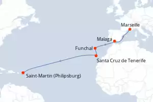 France, Espagne, Madère, Canaries, Antilles Itinéraire: Marseille , Malaga , Funchal , Santa Cruz de Tenerife , Saint-Martin (Philipsburg) Pension Complète Costa Fascinosa 13 jours Cabine standard Marseille 21/11/2025 dès 669 € Enfants Gratuits jusqu'à 18 ans Club Enfants dès 3 ans Pension Complète Départ de France Voir les offres