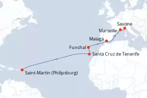 Italie, France, Espagne, Madère, Canaries, Antilles Itinéraire: Savone , Marseille , Malaga , Funchal , Santa Cruz de Tenerife , Saint-Martin (Philipsburg) Pension Complète Costa Fascinosa 14 jours Cabine standard Savone 20/11/2025 dès 649 € Enfants Gratuits jusqu'à 18 ans Club Enfants dès 3 ans Pension Complète Voir les offres