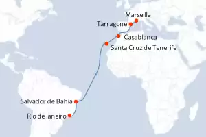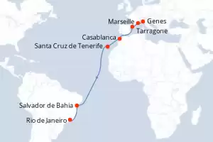 Italie,France,Maroc,Espagne,Brésil Itinéraire: Genes , Marseille , Tarragone , Casablanca , Santa Cruz de Tenerife , Salvador de Bahia , Rio de Janeiro Pension Complète MSC Musica 16 jours Cabine standard Genes 27/10/2026 dès 741 € Black friday jusqu'à -50% Internet à bord Clubs Enfants dès 3 ans Enfants Gratuits jusqu'à 12 ans Pension Complète Voir les offres