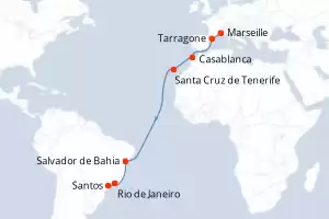 France,Maroc,Espagne,Brésil Itinéraire: Marseille , Tarragone , Casablanca , Santa Cruz de Tenerife , Salvador de Bahia , Rio de Janeiro , Santos Pension Complète MSC Musica 16 jours Cabine standard Marseille 28/10/2026 dès 741 € Black friday jusqu'à -50% Internet à bord Clubs Enfants dès 3 ans Enfants Gratuits jusqu'à 12 ans Pension Complète Départ de France Voir les offres