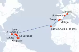 Rép.Dominicaine, Antilles, Iles Vierges, Canaries, Maroc, Espagne, France Itinéraire: La Romana , Kingstown , La Barbade , Pointe a Pitre , St Kitts , Tortola , La Romana , Saint-Martin (Philipsburg) , Santa Cruz de Tenerife , Tanger , Malaga , Barcelone , Marseille Pension Complète Costa Fascinosa 23 jours Cabine standard La Romana 28/02/2027 dès 1389 € Enfants Gratuits jusqu'à 18 ans Club Enfants dès 3 ans Pension Complète Voir les offres