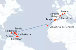 Antilles, Iles Vierges, Canaries, Maroc, Espagne, France, Italie Itinéraire: Pointe a Pitre , St Kitts , Tortola , Saint Domingue , Saint-Martin (Philipsburg) , Fort de France , Pointe a Pitre , St Kitts , Antigua , Santa Cruz de Tenerife , Tanger , Malaga , Barcelone , Marseille , Savone Pension Complète Costa Favolosa 24 jours Cabine standard Pointe a Pitre 26/02/2027 dès 1359 € Enfants Gratuits jusqu'à 18 ans Club Enfants dès 3 ans Pension Complète Voir les offres