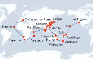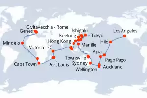 États-Unis,Samoa,Fidji (Îles),Nouvelle-Zélande,Australie,Philippines,Taïwan,Japon,Corée du Sud,Chine,Vietnam,Singapour,Malaisie,Seychelles,Maurice,France,Afrique du Sud,Namibie,Cap-Vert,Italie Itinéraire: Los Angeles , Hilo , Pago Pago , Apia , Suva , Auckland , Auckland , Wellington , Sydney , Sydney , Townsville , Cairns , Manille , Manille , Keelung , Ishigaki , Naha , Tokyo , Tokyo , Nagasaki , Busan , Shanghai , Hong Kong , Da Nang , Singapour , Port Klang , Penang , Victoria - SC , Port Louis , Port Louis , La possession , Cape Town , Cape Town , Walvis Bay , Mindelo , Civitavecchia - Rome Pension Complète MSC Magnifica 98 jours Cabine balcon Los Angeles 06/02/2026 dès 17494 € Internet à bord Clubs Enfants dès 3 ans Enfants Gratuits jusqu'à 12 ans Pension Complète Voir les offres