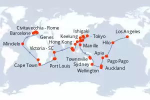 États-Unis,Samoa,Fidji (Îles),Nouvelle-Zélande,Australie,Philippines,Taïwan,Japon,Corée du Sud,Chine,Vietnam,Singapour,Malaisie,Seychelles,Maurice,Afrique du Sud,Namibie,Cap-Vert,Italie,France,Espagne Itinéraire: Los Angeles , Hilo , Pago Pago , Apia , Suva , Auckland , Auckland , Wellington , Sydney , Sydney , Townsville , Cairns , Manille , Manille , Keelung , Ishigaki , Naha , Tokyo , Tokyo , Nagasaki , Busan , Shanghai , Hong Kong , Da Nang , Singapour , Port Klang , Penang , Victoria - SC , Port Louis , Port Louis , La possession , Cape Town , Cape Town , Walvis Bay , Mindelo , Civitavecchia - Rome , Livourne , Genes , Marseille , Barcelone Pension Complète MSC Magnifica 102 jours Cabine standard Los Angeles 06/02/2026 dès 12882 € Internet à bord Clubs Enfants dès 3 ans Enfants Gratuits jusqu'à 12 ans Pension Complète Voir les offres
