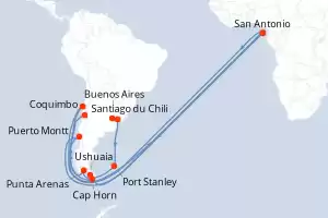 Chili,Royaume-Uni,Uruguay,Argentine Itinéraire: San antonio Chili , Puerto Montt , Puerto Chacabuco , Amalia Glacier Canal , Punta Arenas , Ushuaia , Cabo Hornos , Iles Falkland , Puerto Madryn , Montevideo , Buenos Aires , Buenos Aires Pension Complète Sapphire princess 17 jours Cabine standard San antonio Chili 06/12/2025 dès 1566 € Croisière Premium Cuisine raffinée Service personalisé Pension Complète Voir les offres