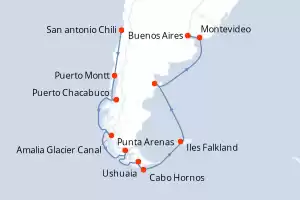 Croisière en Patagonie et Terre de Feu Itinéraire: Santiago de Chile , Santiago de Chile , Puerto San Antonio , Puerto Montt , Puerto Chacabuco , Fjords Chiliens , Fjords Chiliens , Punta Arenas , Ushuaia , Cap Horn , Port Stanley , Montevideo , Buenos Aires , Buenos Aires , Buenos Aires Pension Complète MS Oosterdam 18 jours Cabine standard Santiago de Chile 02/12/2025 + dès 5990 € Vol inclus 100% Francophone Conférences à bord incluses Pension Complète Voir les offres