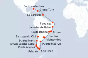 États-Unis, Chili, Argentine, Uruguay, Brésil, Barbade Itinéraire: Fort Lauderdale , Grand Turk , La Barbade , Fortaleza , Salvador de Bahia , Buzios , Rio de Janeiro , Rio de Janeiro , Santos , Montevideo , Buenos Aires , Buenos Aires , Puerto Madryn , Ushuaia , Cap Horn , Punta Arenas , Amalia Glacier Canal , Glacier Pio X , Puerto Montt , Santiago de Chile Pension Complète Queen Anne 38 jours Cabine standard Fort Lauderdale 22/01/2027 dès 6951 € Élégance & Raffinement Britannique Navire de Légende Room Service 24h/24 Pension Complète Voir les offres