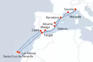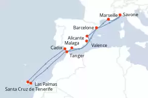France, Espagne, Canaries, Maroc, Italie Itinéraire: Marseille , Barcelone , Malaga , Cadix , Santa Cruz de Tenerife , Las Palmas , Tanger , Alicante , Valence , Barcelone , Savone , Marseille Pension Complète Costa Toscana 16 jours Cabine standard Marseille 14/11/2025 dès 789 € 0 Supplément single Enfants Gratuits jusqu'à 18 ans Club Enfants dès 3 ans Pension Complète Départ de France Autres ports d'embarquement : Savone Voir les offres