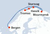 Découvrez une grande ville européenne à l'intérieur du cercle polaire lors d'une escale au cours d'une croisière. Tromso est une ville du nord de la Norvège, située dans le comté de Troms au nord du cercle polaire arctique. Le centre-ville se dresse sur la côte orientale de l'île de Tromsoya, les zones périurbaines de Tromso comprennent : Kroken, Tromsdalen et quelques parties de l'île de Kvaloya. L' île de Tromso est reliée au continent où s'étend la nouvelle ville par un tunnel et un pont a quatre voies. À l'ouest, le pont Sandnessund permet une liaison avec Kvaloya. Tromso est également dominé par les Alpes de Lygen avec un sommet qui culmine à 1800 mères. La ville est le point de départ des expéditions polaire, Tromso est aussi la porte d'entrée du Svalbard, un archipel à mi-chemin entre la Norvège et le pôle Nord. Tromso possède le plus grand port de pêche de l'arctique norvégien. Le port accueille également les bateaux de la ligne de l'Express côtier.